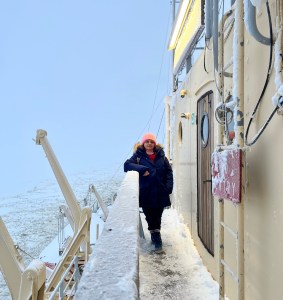 Up on the open roof deck, the wind was relentless. My eyelashes froze. The chill cut through my cap and gloves. Below us, the sea cracked open under the ship’s force — great sheets of ice splintering apart like glass. It wasn’t just sound — it was sensation. A deep vibration that ripples through your body and makes you feel humbled by the scale of it.
