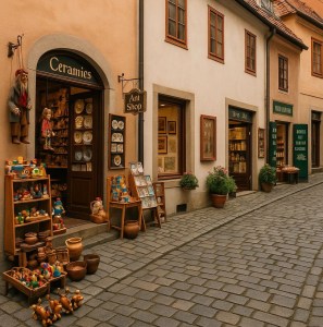 The first thing you notice are the small cute shops that focus on local craftsmanship– wooden toys, marionettes, ceramics, glassware, and small art galleries. You’ll also find boutiques selling local honey, teas, and handmade souvenirs. Shopping here feels personal and unrushed, with cute shops that let you browse at your own pace.